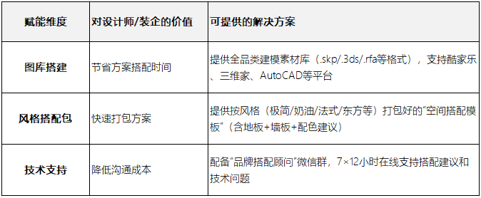 与此同时,随着家装决策链条日益前置,“设计师+装企”已经成为消费入口的核心节点。他们不只是转介绍者,更是“信任代理人”与“方案整合者”。要想打入这条通路,不能靠简单的“返点+铺货”,而要提供解决他们“赢客户+提效率+出方案”痛点的系统性解决方案。