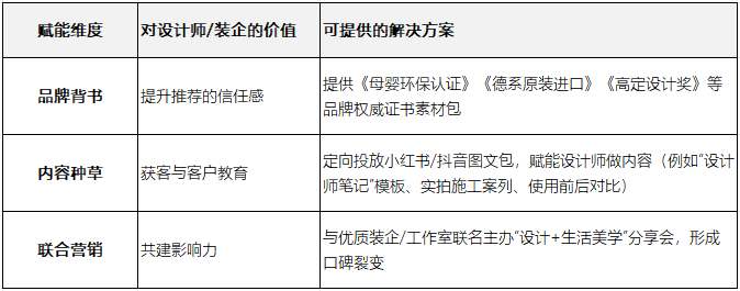 - 从流量争夺转向“共创共生”关系打造:将设计师/装企从销售“下游”变为品牌“共建者”。
